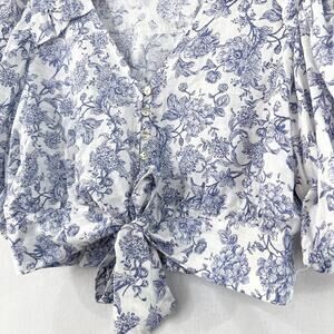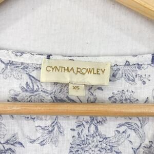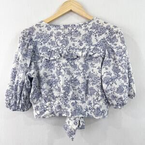 Cynthia Rowley Women's Blue Floral Linen Blend Crop Blouse XS Puff Sleeve Boho