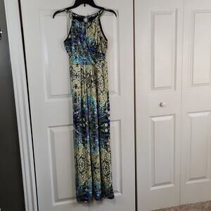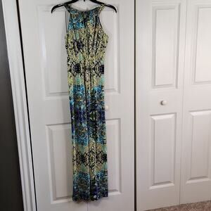 Beautiful maxi dress by Cynthia Rowley. Blue, yellow, purple, green, white, & black abstract print. Faux wrap on chest. Keyholes front & back. Button closure. Has stretch. EUC