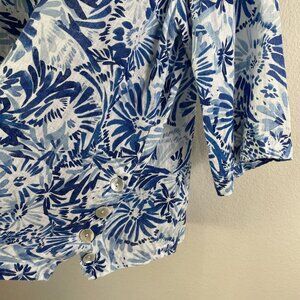 Cynthia Rowley Womens Plus 2X Blue White Floral 100% Linen Button Up Shirt