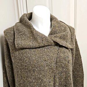 Cozy and stylish, this Cynthia Rowley wool blend cardigan sweater features a soft shawl collar and functional front pockets for everyday comfort. The yarn is beautifully flecked with subtle colors, creating a rich tweed-inspired texture. Its unique gray-olive background tone adds a touch of earthy sophistication — perfect for layering during cool-weather days.