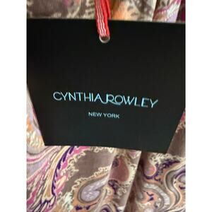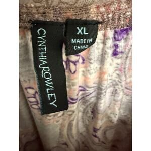 This Cynthia Rowley slip nightgown in size XL features a vibrant paisley print in purple, pink, brown, and orange with delicate lace trim at the neckline. Crafted from a soft rayon-spandex blend, it offers both stretch and comfort. Adjustable straps provide a customized fit, making it ideal for lounging, sleeping, or layering as a boho-inspired slip dress.