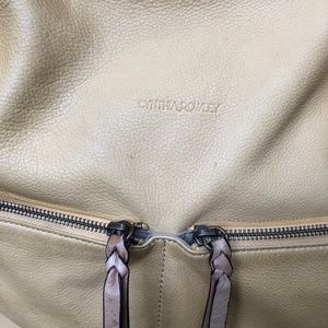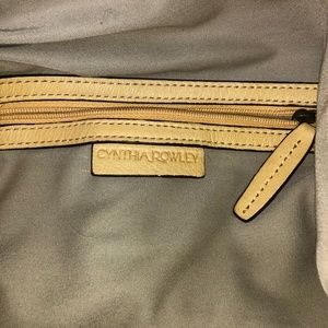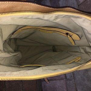 Gorgeous light golden yellow leather with tan trim tote bag by Cynthia Rowley. The leather on this bag is super soft and supple. Features double buckles on the strap with bronze hardware. Good used condition. There are some watermarks on the back of the bag.