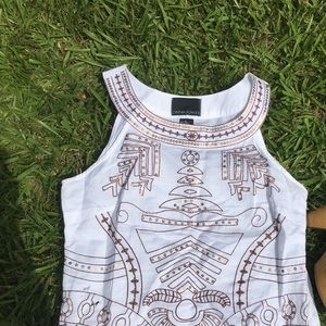 Cynthia Rowley embroidered linen top is size medium and new without tags with no defects. Top has a scoop neck and is sleeveless. It is made of lightweight linen and has bronze Aztec embroidery with sequin accents on the front. Hidden zipper on the side. Measurements are : armpit to armpit: 18 inches, top of shoulder to hem: 25 inches. Feel free to message me with any questions or make offers!