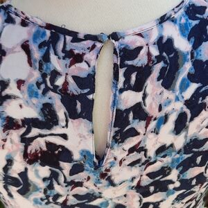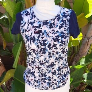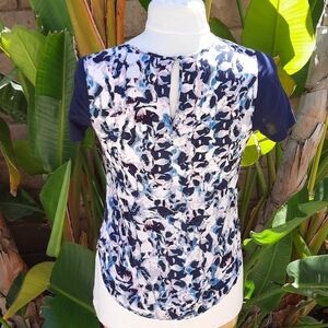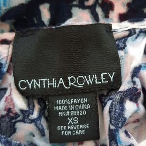 Cynthia Rowley size extra small pink and navy blue abstract print blouse. Very good pre-owned condition. Smoke free pet friendly home. Please see pictures for measurements. Blouse short sleeve abstract print navy pink extra small Cynthia Rowley