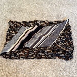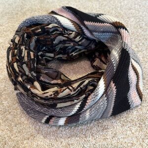 This is a beautiful knit infinity scarf by designer Cynthia Rowley. Gorgeous design with black, brown, tan, pink, and off white elements. Super cozy and soft. In wonderful condition. One size.