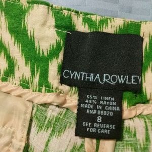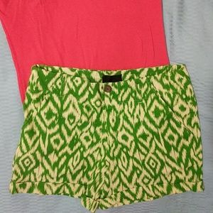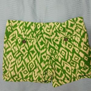 Sweet green and cream colored linen/rayon blend, cuffed shorts. Excellent condition! Measures 16.5 inches across waist, 4" inseam