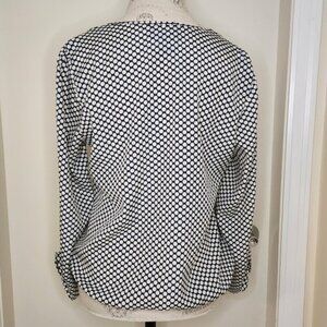 Mediterranean Blue off White Polkadot Print deep Vneck 3/4 sleeve Blouse top, by Cynthia Rowley.