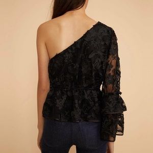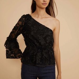 One sleeve ruffle lace top with embroidery and hanging details. Sheer mesh overlay and ruffle detail on the sleeve and hem. Barcode tag will be crossed out when sent out.