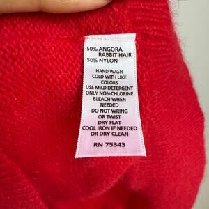 This is a pre-owned Cynthia Rowley red sweater, size M. It features a round neckline and three-quarter sleeves. The material is 50% angora rabbit hair and 50% nylon. The sweater has a ribbed hem and cuffs. There are decorative knit details at the shoulder seams. The sweater is in good condition with no visible stains or tears.