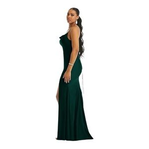 Full length Luxe Stretch Satin gown with elegant cowl v-neckline and open gathered tie back. Dramatic mermaid skirt has front slit and godets. Slight train cuts a dramatic silhouette as you walk.