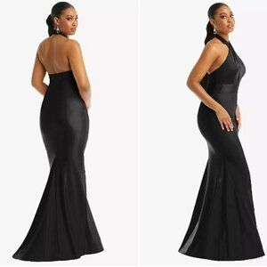 Black Stretch Satin Criss Cross Halter Open-Back Mermaid Dress in Size Medium by Cynthia & Sahar by Dessy Collection.