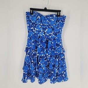 Cynthia Steffe 100% Silk Blue and White Floral Strapless Ruffled Mini Dress Sz 8