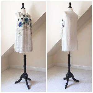 New with tags! Cynthia Steffe Beaded Cocktail Dress...beaded flowers and stripes...shift style...sleeveless, scoop neck...pullover with keyhole back...total length 36"...bust across 19"...waist across 19.5"...100% polyester chiffon. Size 10. Retail $328