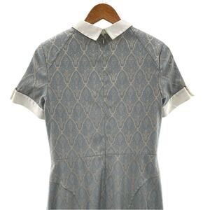 Boasting a simple and effective silhouette with a mod twist by use of the quintessential sixties white collar and cuffed sleeves with cold button accents. This jacquard a-line dress is an absolute show stopper.