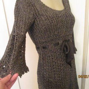 Cute and classy gray tweed crochet dress with empire waist and a bow front. The cotton dress has a sheath lining and 3/4" bell sleeves. In excellent condition . Made of wool, silk, nylon. The lining is polyester and rayon.