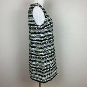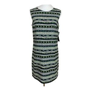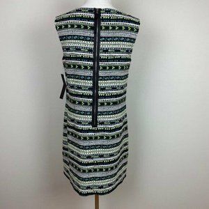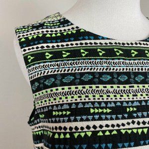 Women's size 6 mini sheath dress. Fun tribal black, neon green, blue and white print throughout. Textured. Sleeveless with exposed back zip. Classic neckline. Above knee. Great dress for an assortment of occasions.