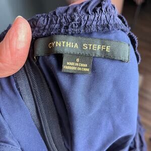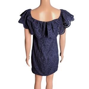 This Cynthia Steffe vintage peasant style mini dress is navy blue with an eyelet design. Can be worn off the shoulder if desired. Great dress for cruise wear, resort wear, beach, coastal, summer parties. Preppy, coquette style.