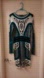 Beautiful size Medium, over-the-head with long sleeves. Rayon/Nylon blend. Length 40" from the back of the neck to the hemline, pit to pit approx 16" flat unstretched, waist approx 14" flat unstretched.