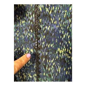 This Retro Mixed Professional dress is super versatile. You can wear it from a career-focused look to a casual day out or even a night on the town. It’s got a tiered skirt, a button-up drop waist, and a cute collar with a neck tie. Plus, there are sheer panels on the shoulders and back, and it’s speckled with blue, yellow, and white. Oh, and it’s got some black lace detailing and bell-shaped cuffs that add a touch of elegance.