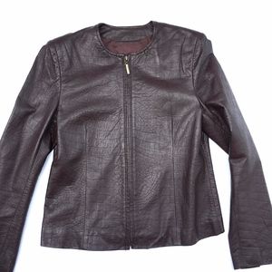 Vintage Cynthia Steffe New York Dark Chocolate Brown Genuine 100% Leather Cropped Jacket. Embossed reptile alligator crocodile snake Fully lined, antique gold brass zip front. Collarless round neck, padded shoulder pads.