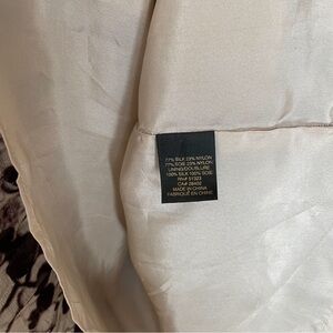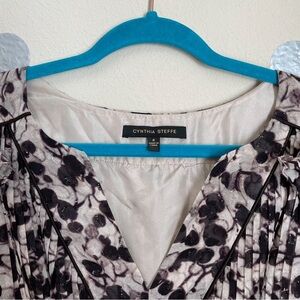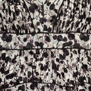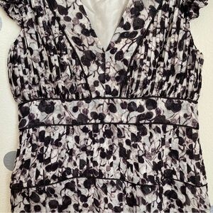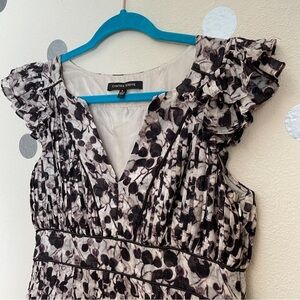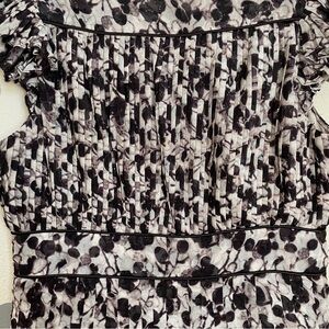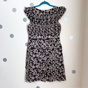 Brown and tan abstract floral pattern midi-length silk dress with silver metallic threads. Had ruffled cap sleeves, a round neckline with a V, tiered skirt, pintucks and piping at the top of the dress with pleats in the skirt and a side zip. Excellent used condition, no flaws that I can see.