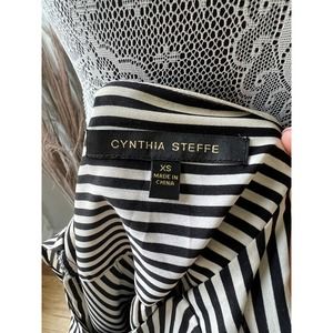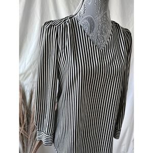 Cynthia Steffe Striped Blouse. V neckline, black and white vertical stripes, puffed sleeves. Silky, breezy material. Feminine and classic.