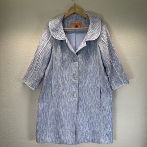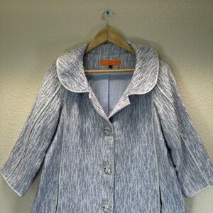 Cynthia Steffe Textured Coat Womens M Pockets, 3/4 Sleeves, Peter Pan collar, Button front closure, Lined, Cotton/Silk Blend, Purple /White with textured thread and sparkly silver trim. Casual, Business Casual, Spring Summer Layer
