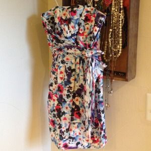 Never worn, silk Cynthia Steffe Nadia dress, strapless, side gathered, pleated tulip silhouette, stored hanging in zipped bag, no tags, size 4.