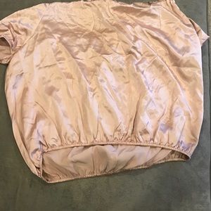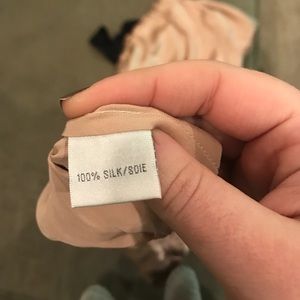 Gorgeous silk blush/ champagne color blouse with black bow tie at neck- elastic at bottom and arms - stunning and bow can be tied as you wish! Wore a few times and people complimented it like crazy!