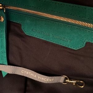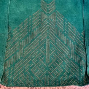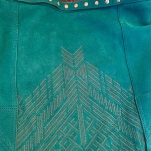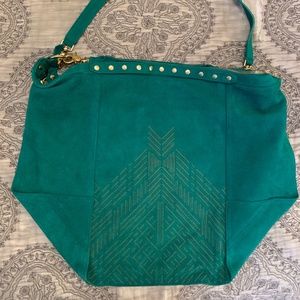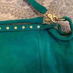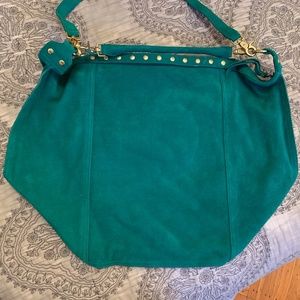 Cynthia Vincent Emerald Green Suede Boho Handbag with handle and detachable shoulder strap. New without tags.
