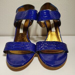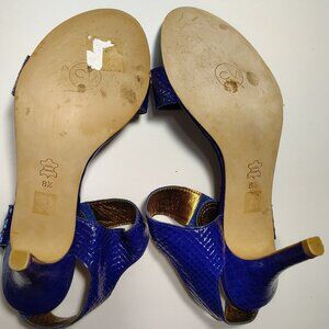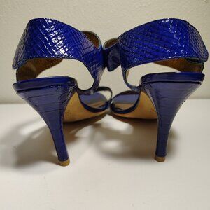 Blue patent leather reptile skin with open toe and stilettoed heel