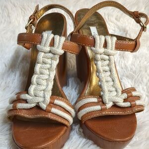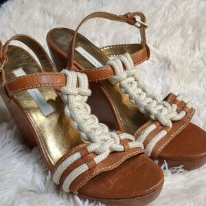 Cynthia Vincent Wood Block Heels with Macrame Weave. Excellent condition, new without tags. Offers always warmly received. 5.5" heel, 1" platform. Cynthia Vincent Wood Wedge Heel.