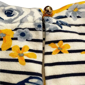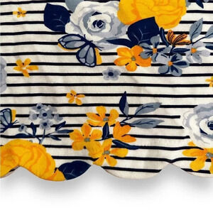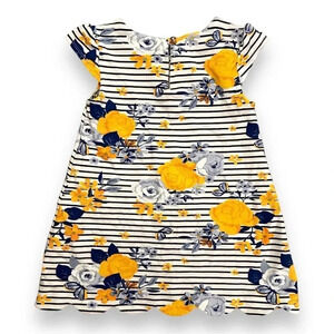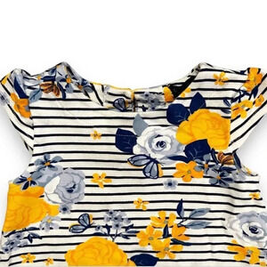 Bright and pretty cap sleeve dress with scalloped hem. Bright yellow flowers on a navy striped background with butterflies. Back keyhole button closure. Tag is missing but is a size 2-3 yrs.