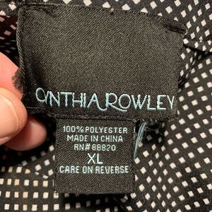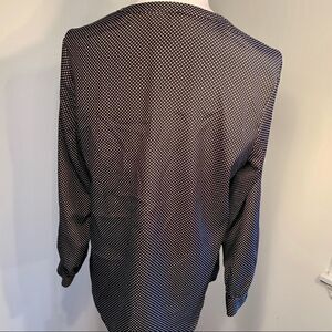Cynthia Rowley black and white polka dot long sleeve top with two front flap pox, overall stretch, v-neck and buttoned cuffs. Armpit-to-armpit 22”, sleeve 23” and length 30”.