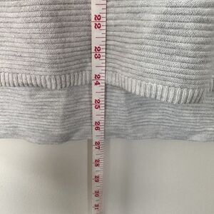 Features: Turtleneck/ Cowlnweck with drawstring Grey with black detailing. Split side hem, longer in the back, tie on cowl neck . Ribbed texture. Beau teal dove grey