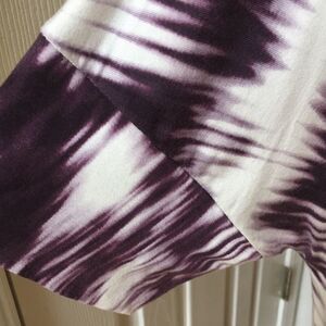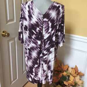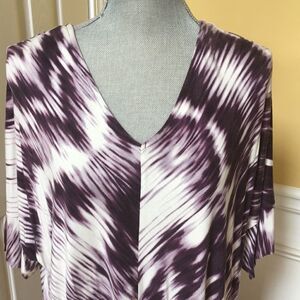 Cynthia Rowley tunic is both soft and cute!! It’s purple and white and has a zipper in the back. Half sleeve. Worn once. Underarm flat across is 26”. Shoulder to hem is 34”.