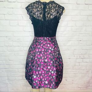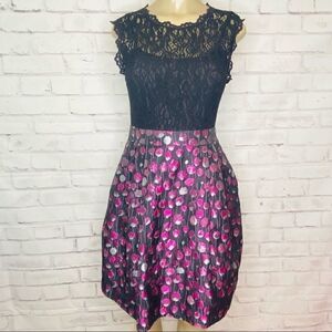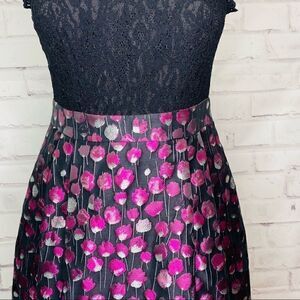Cynthia Steffe 'Falling Poppies' Lace Bodice Jacquard Fit & Flare Dress. A black lace bodice with illusion yokes heightens the drama of a charming fit-and-flare dress polished with a gleaming jacquard skirt adrift with pretty poppies. Scalloped edges at the neck and arm openings are a suitably romantic touch.