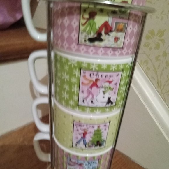 Cypress Set of 4 Coffee or Espresso Ceramic mugs with silver metal rack New