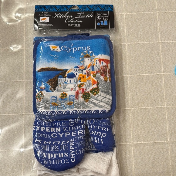 Beautiful Cyprus-themed kitchen textile set. Includes vibrant blue and white designs with scenic imagery.