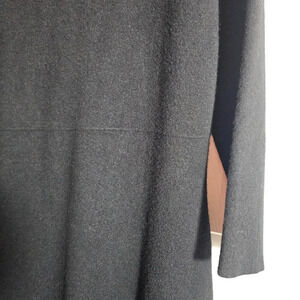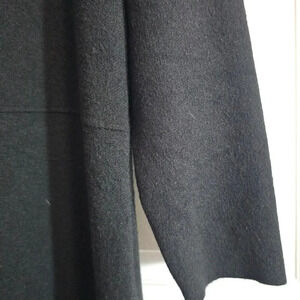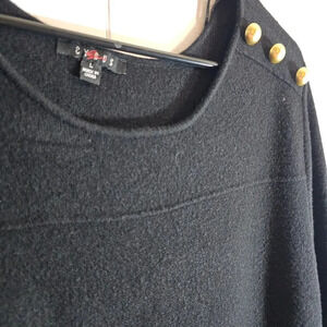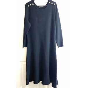 Beautiful black sweater dress with gold faux buttons on shoulders. Thick smooth knit for luxurious feel and great fit. Seaming detail at chest, waist, and knee. Long sleeves.