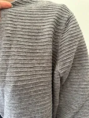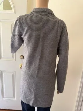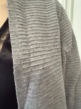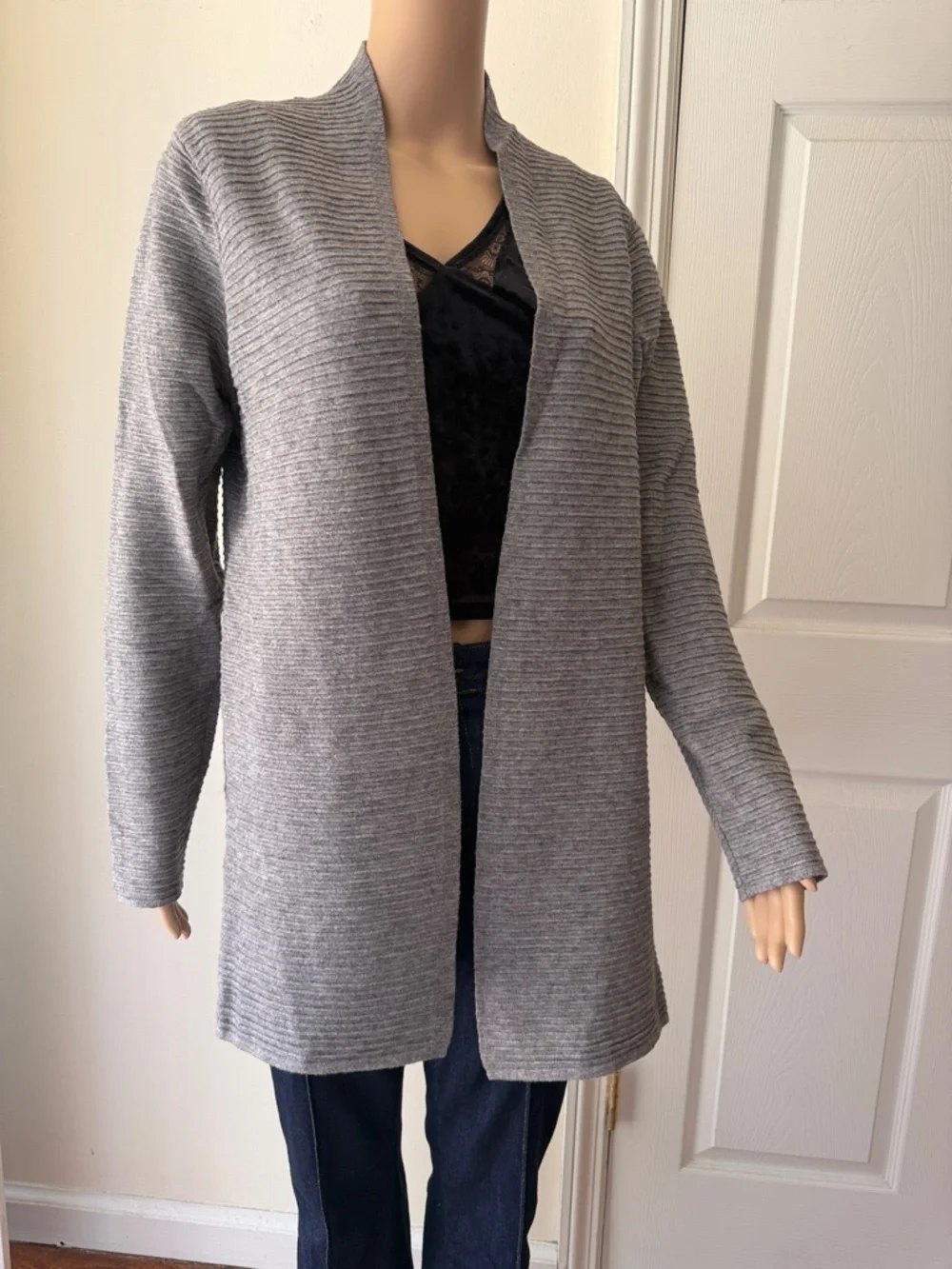 Open-front cardigan with horizontal ribbed texture. Long sleeves and relaxed silhouette. Lightweight knit for layering. Neutral light gray pairs easily with outfits.