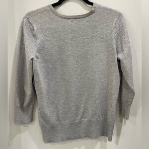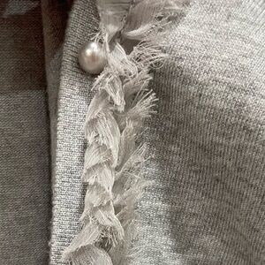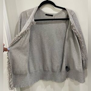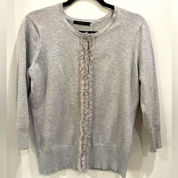 Chic light gray cardigan with ruffled detail. Ideal for layering and adding elegance.