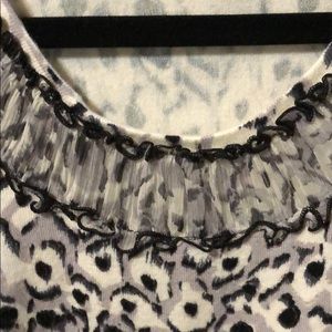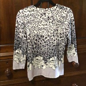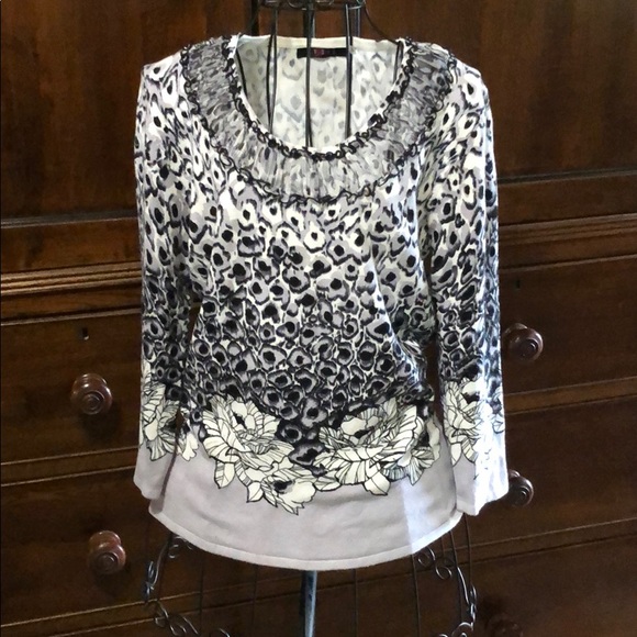 Very good used condition. Sweater from shoulder to bottom is 24”, pit to pit 17”, sleeve from shoulder is 20”. About a 3/4 sleeve length. Around front collar is a sheer fabric that blends with pattern of sweater. The mannequin isn’t the best for displaying the sweater, it hangs loose at the bottom with an overall loose fit. Size small.