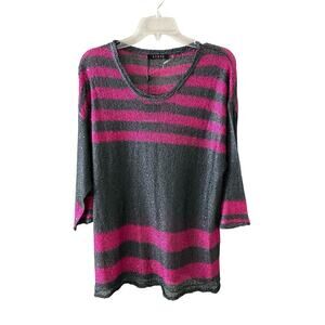 Cyrus Sweater Open Knit 3/4 Sleeve Pullover Striped Glitter Pink Large