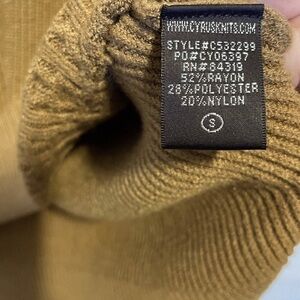 Cyrus Women’s Crew Neck Ribbed Tunic Sweater Brown Sugar Color Small NWT, Extra Long. High Low Hem, Cable knit detailing, oversized fit, rich brown sugar color pais perfectly with many items, Hand Wash. Cable Knit Design on Lower Front.. Bell Shaped at Wrist on Sleeve. Pullover. Designer. Back is longer than front to cover that Bootie if needed.