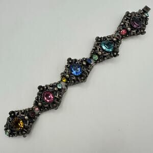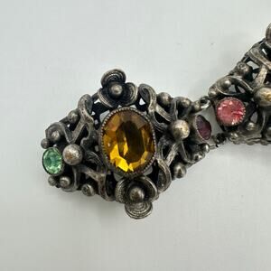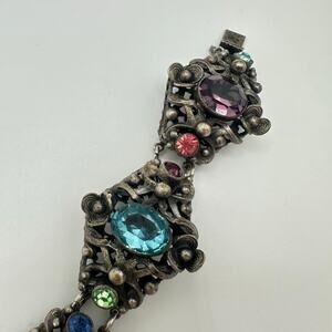 Czech 1920s antique silver tone multicolor rhinestones Uranium glass bracelet