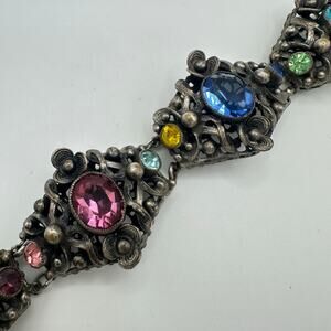 Excellent antique condition, shows only hints of wear. This gorgeous piece features all bezel-set Czech glass rhinestones in pastel hues including pink, topaz yellow, green, blue, and purple. Two green rhinestones and, surprisingly, one large pink rhinestone, are uranium glass and fluoresce vividly under UV. Each panel features a machine stamped filigree underside, lattice-style sides, and all hand-worked and soldered upper filigree flowers. This piece is almost certainly Czech in origin though Austro-Hungarian influence can also be seen. Length is 7.5" and box clasp functions perfectly. Please see photos for width measurements in inches.