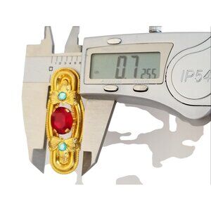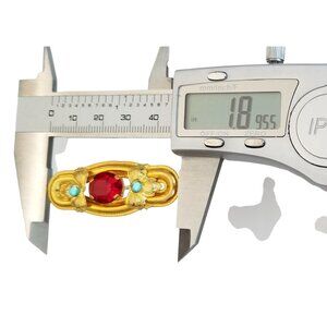 This exquisite Art Nouveau-style bar brooch will make a great addition to your collection. Constructed in France from vintage stones - a gold-tone plated floral and leaf style base finished with prong set red faceted Czech glass at the center. And two blue rhinestones highlighted the flower design. Measures approximately 1.8 inches in width and 0.7 inches in length. The back has a secure C clasp pin.