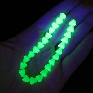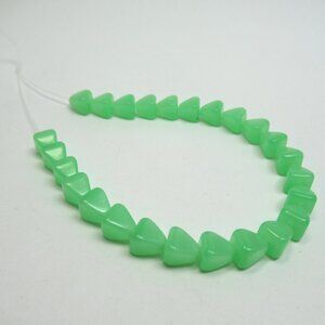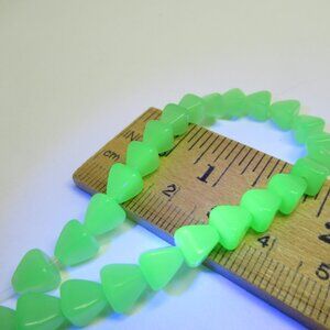 This listing is for the strand of 25 Czech Uranium glass pyramid beads pictured. They have never been used, are vintage stock and come temporarily strung on monofilament. These beads are a beautiful bright milky green color and glow brightly under blacklight. The beads glow under blacklight because of the Uranium used in making and coloring the glass.