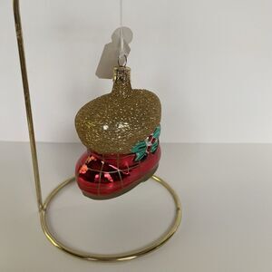 Czech blown glass santa boot Christmas tree ornament with hand detail.